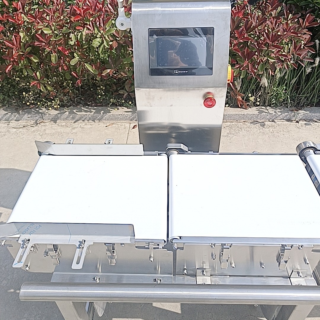 皮帶檢重秤是一(yī)種通過皮帶傳動的方式將物料(liào)搬運到稱(chēng)重設備上進行計量的裝置。它通常由皮帶傳送機、配重係統、傳感器等部分組成。皮帶作為物料的傳送部分,將物料平穩地搬運到稱重區域(yù),同時傳感器實時(shí)檢測皮帶的張力變化,以計算出物料的重量(liàng)。