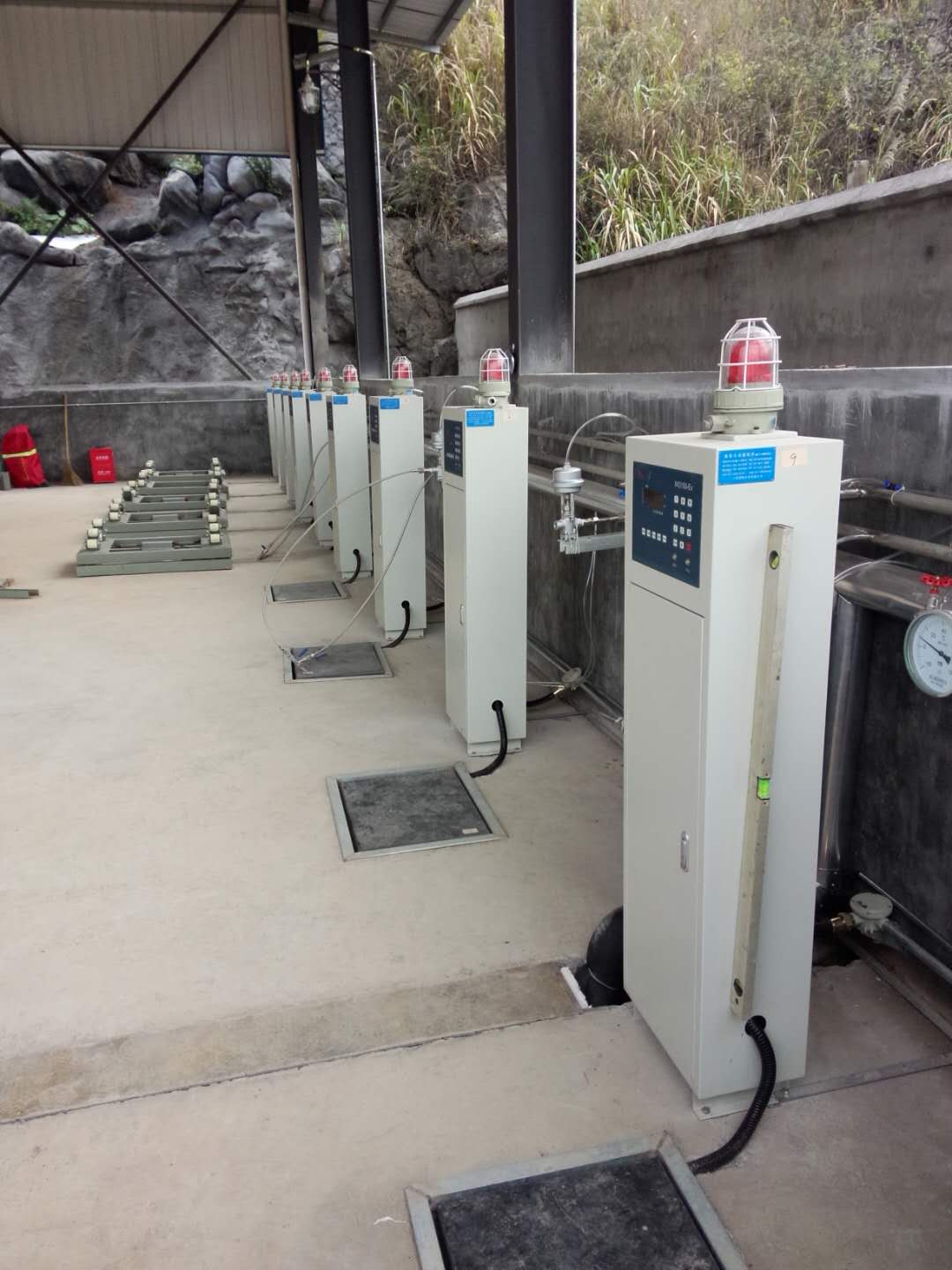 稱重秤台由型材和板材焊接而成,稱重傳感器固定(dìng)在秤台中,待灌裝或複檢鋼瓶置於秤(chèng)台(tái)上進行灌(guàn)裝或檢斤。